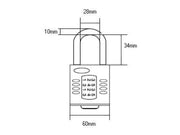 The combination wheels are spaced comfortably apart, making them easier to use, with push-button operation. The recodable mechanism offers 10,000 possible combinations on the 4-wheel and 100,000 possible combinations on the 5-wheel, making them very difficult to pick.