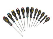 12 Piece Set of Stanley FatMax® Screwdrivers, which each have a chrome vanadium steel bar which allows high torque and reduces the risk of tip breakage. Handles are moulded directly to the shaft for a virtually unbreakable bond to give long life and durability.