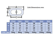 These Faithfull Welded Chains are manufactured from a mild steel with a Black Japanned finish. These chains are load tested, but not certified and should never be used for any overhead lifting, load binding or towing applications.